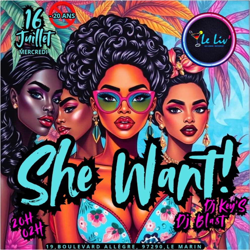Tu te demandes souvent mais que veut-elle ? Alors rendez-vous *MERCREDI 16 JUILLET* 🧏🏾♀️ *SHE WANT!* 💃🏾 🎧 *Dj blast x Dj Key’S* *⏰ 20H-02H* 📍 *Le LiV’Bar* 🔞 - 20 ANS ❌🚫 NO SANDALES ❌🚫 NO CASQUETTES ❌🚫 NO SACOCHES ❌🚫