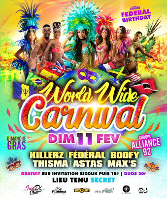🇧🇧🇧🇷🇪🇸🇬🇧🇫🇷🇯🇲🇺🇸🇹🇹 *WORLDWIDE CARNIVAL* 🇧🇧🇧🇷🇪🇸🇬🇧🇫🇷🇯🇲🇺🇸🇹🇹 Le concept est simple nous allons ramener tout les carnavals l’instant d’une soirée… Barbade 🇧🇧 Brésil 🇧🇷 Espagne 🇪🇸 Royaume-Unis 🇬🇧 France 🇫🇷 Jamaïque 🇯🇲 États-Unis 🇺🇸 Trinidad 🇹🇹 Soyez Créatif Les Plus beaux Costumes Seront Récompensées … 🎧 *KILLERZ • FÉDÉRAL • BOOFY • THISMA • ASTAS • MAX’S* 🎧 🥁 *ALLIANCE 92* 🥁 🎟️ *GRATUIT SUR INVITATIONS AVANT 23H* *BIZOUK ➡️* https://my.bizo...
