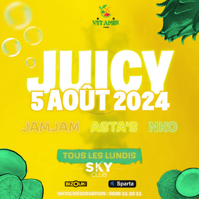 JUICY by VITAMIN ÉVENTS Prépare-toi pour une soirée mémorable tous les lundis au SKY CLUB ! Ce lundi 05 Août , viens vibrer au rythme de DJ JAMJAM, DJ NKO et DJ ASTA'S qui feront monter l'ambiance au Sky. Lieu : SKYCLUB MARTINIQUE Réservation Salons et informations au : 0696.11.10.11 **Billets disponibles sur BIZOUK & SPARTA:** DRESS CODE : TENUE CORRECTE OBLIGATOIRE ! Viens t'amuser et faire la fête avec nous ! I