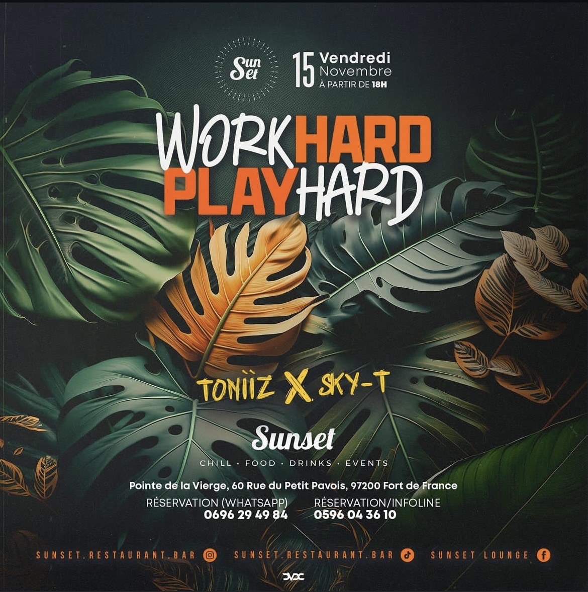 SUNSET RESTAURANT & LOUNGE Restaurant•Bar• Tapas•Cocktails RESERVATIONS/INFO +596 696 29 49 84 (WhatsApp) +596 696 54 05 30 (WhatsApp) 1田 +596 596 04 36 10 Pointe de la Vierge, 60 Rue Du Petit Pavois, Fort-de-France 97200, Martinique FOLLOW US Instagram: @sunset.restaurant.bar TikTok : @sunset.restaurant.bar Facebook: Sunset Martinique YouTube : Sunset Martinique L'abus d'alcool est dangereux pour la santé à consommer avec modération.