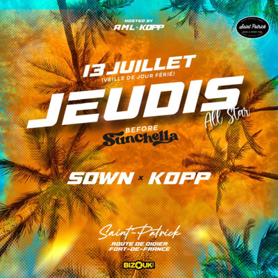 Le jeudis ALL STAR Éd. Before _Sunchella Ce Jeudi, on continue avec un invité de taille pour une édition spéciale. #VeilleDeJourFérié DJ KOPP accueille un pilier du SHENDOU GANG ! Welcome Dj Sown Leur mission sera de vous mettre dans l’ambiance par tous les moyens et d’envoyer tout le monde en l’air Base secrète : Le Saint Patrick Arrive tôt, de quoi bien commencer le week-end en avance . Réservation table recommandé Infos & Résa: 0696.06.00.26 (Whatsapp, SMS)