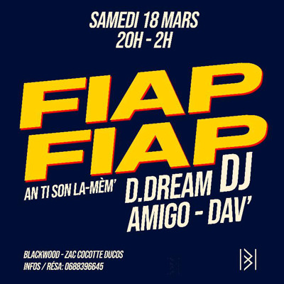 Tu as déjà toutes les infos ! DJ : D DREAM - AMIGO - DAV' LIEU : BLACKWOOD SOCIAL CLUB HORAIRES : 20H - 2H Tu n'as plus qu'à réserver ton salon, FIAP FIAP ! On te rappelle que les sacoches, les casquettes, et les tenues sportwear sont proscrites ⛔ Réservation et infos : +33688396645