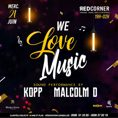 _🎼🥳 FÊTE DE LA MUSIQUE au REDCORNER. *📆 MERCREDI 21 JUIN* tes Djs *KOPP* et *MALCOM D* te donnent rendez-vous au *📍REDCORNER* De 19h À 2h pour une soirée *EXCEPTIONNELLE* ou nous mettrons la Musique 🎶🪘🎷🎸 à l'honneur 🥳. *🎼❤🔥 WE LOVE MUSIC ❤🔥🎼* *🎧 Dj KOPP* et *🎧Dj MALCOM D* aux platines pour vous Faire voyager 🛩️👅 _Dancehall - Zouk - Salsa - Hip Hop - etc._ *Entrée GRATUITE* Arrivez tôt ! _🍱 Restauration disponible sur place jusqu'à 01h30. 🍱_ _*Réservation de Salons*_ 06...