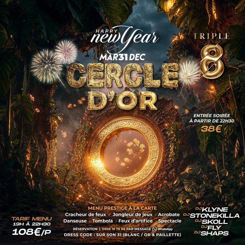 LE CERCLE D’OR : Venez célébrer le 31 décembre avec nous au TRIPLE 8 pour une soirée inoubliable toute la nuit ! Au programme : Un menu d’exception spécialement élaboré pour ravir vos papilles, sublimé par un somptueux buffet froid de crustacés. Des animations spectaculaires pour vous faire rêver : cracheurs de feu, jongleurs, acrobates et bien plus encore. Une tombola avec de gros lots à gagner ! Un incroyable plateau de DJs pour vous faire danser toute la nuit ! DJ KLYNE DJ STONEKILLA DJ...