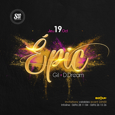 Prêt pour ce voyage qui devrait être une odyssée dans le plein sens du mot ? un voyage épique qui changera tout._ *JEUDI 19 OCTOBRE* à partir de 20h le *Sunset* sera _THE PLACE TO BE_ pour une clientèle avertie bien évidemment. *EPIC* Sera le moment *DJ GIL* *DJ D.DREAM* https://my.bizouk.com/epic-avec-dj-gil Infoline resas&salons: 0696 281 184 0696 842 824