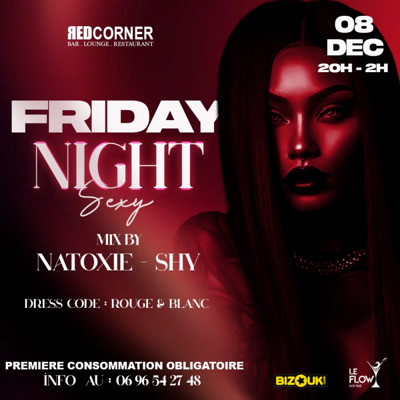 Attention le flow Te donne rendez-vous Vandredi 8 décembre 2023 Pour la Friday night sexy en rouge et blanc 20h/02h au redcorner Dj Natoxie & Shy Alors on écrase la maison Sois Chic et sexy Dresse code Rouge et Blanc Bizouk invitation Première consommation obligatoire Infos au : 0696542748