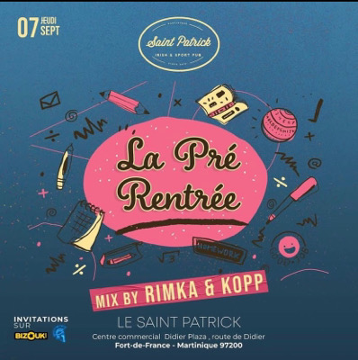 * LA PRÉ RENTRÉE * une dernière révision des classiques de l'été Jeudi 7 Septembre Dès 19 h 00 *RIMKA - KOPP* Entrée gratuite. Réservation table recommandé Infos & Résa: 0696.06.00.26 (Whatsapp, SMS)
