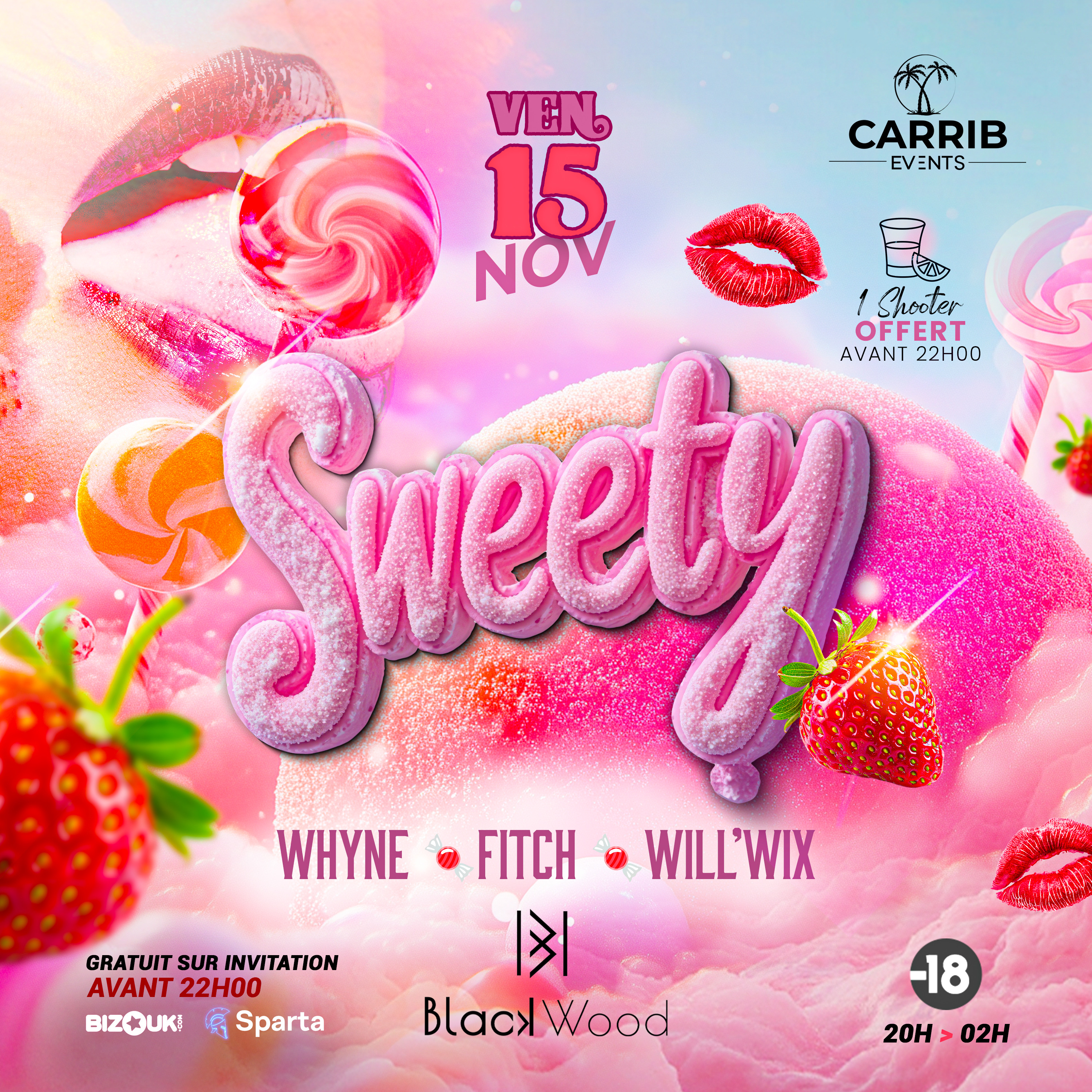 Sweeeetyyy 🍭 Nous te donnons rendez-vous le : 📆 Vendredi 15 novembre 📍 Au Blackwood Pour une nuit délicieusement sucrée.. 🫦& pour faire monter la température les maîtres du moment : 🎧: DJ WHYNE 🎧: DJ FITCH 🎧: DJ WILL’WIX Un shooter spécial t’attendra à l’entrée avant 22h00 !** 🍯🔥 🆓 : Récupère vite ton invitation gratuite avant 22h00 📲 : Infos & réservations de salon au 0696 77 96 18 (WhatsApp) 🔞 Événement strictement interdit aux mineurs ! 𝗢𝘂𝘃𝗲𝗿𝘁 𝗱è𝘀 𝟮𝟬𝗵 ! ...