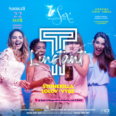 Tous les Samedis c'est L'instant T... 06h00 de bonne musique, de good vibes, l'instant d'un pur moment de détente avec STONEKILLA - VYBZ - LOLOY Clientèle multigénérationelle Happy Hour jusqu'à 21h30 1 CAÏPI ACHETÉE = 1 OFFERTE 0696 051 531 - 0696 790 787 (Seulement sur WhatsApp)