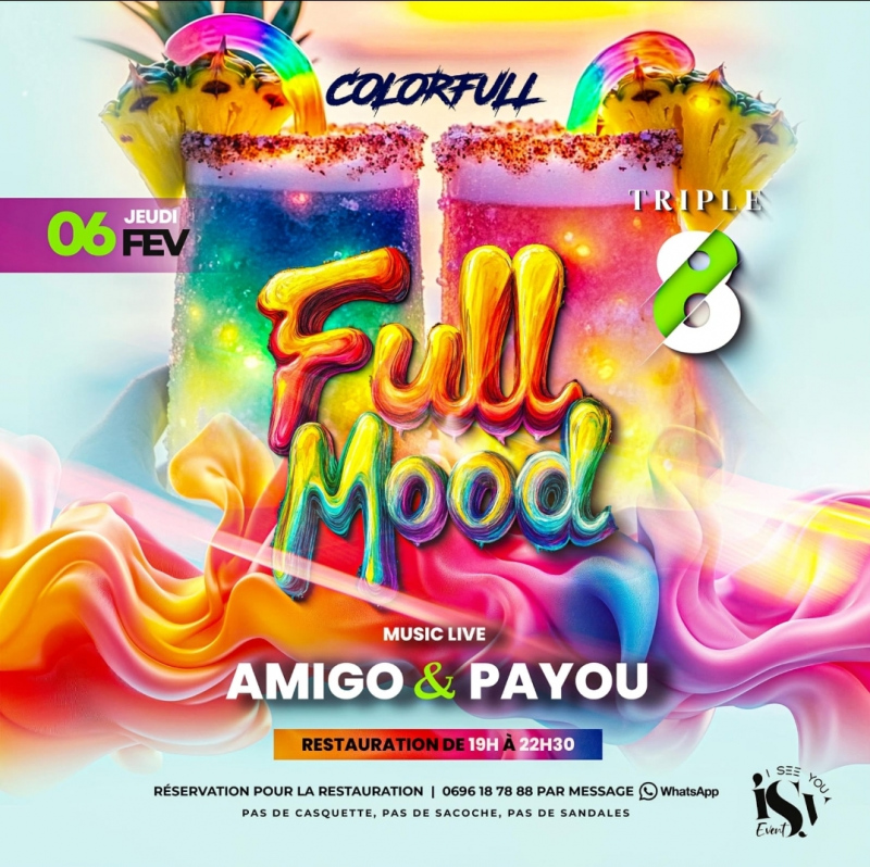 JEUDI 06 FÉVRIER ton rdv du jeudi de 18h30 à 00h!! Full Mood Édition: COLORFULL ••••••••••••••••••••••••••#OuvertureDesPortes 18h30Restauration à table disponible de 18h30 à 21h30 puis snacking de 21h30 à 00hTRIPLE8 TENUES ET ESPRITS CORRECTS EXIGÉS;LA DIRECTION SE RÉSERVE LE DROIT D'ENTREE. Il est conseillé d'arriver tôt car une invitation ne garantit pas le droit d'accès et privilégier le covoiturage