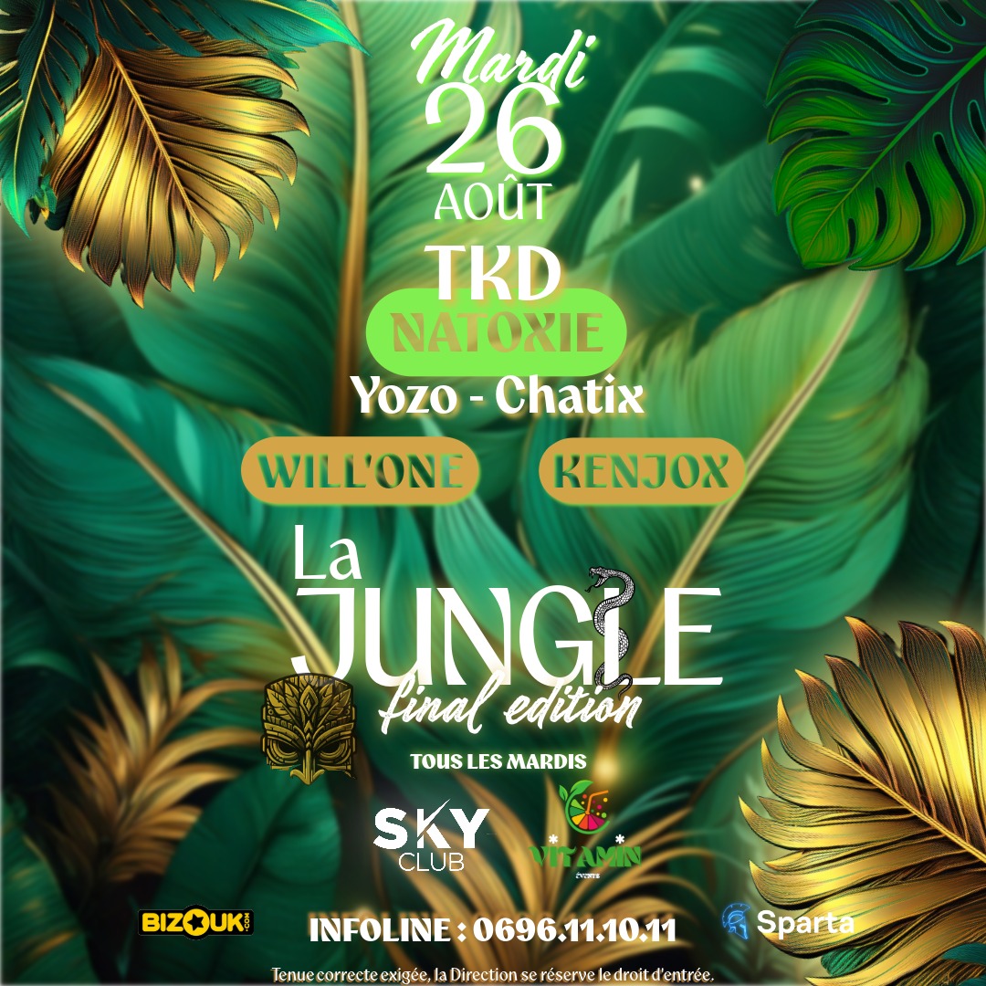 Ce mardi, La JUNGLE revient au SkyClub. La JUNGLE x TKD – Là où la nuit devient légende Quatrième chapitre d’une saga nocturne qui enflamme déjà les nuits foyalaises. Sauvage, sensuelle, envoûtante… Aux commandes : Les membres du collectif TKD : Natoxie, accompagné de Yozo & Chatix, pour un set surpuissant Will’One, l’énergie pure et explosive Kenjox, les vibes hypnotiques et enivrantes Décor luxuriant complètement métamorphosé.. Une immersion sauvage pensée pour électriser chaque instant....