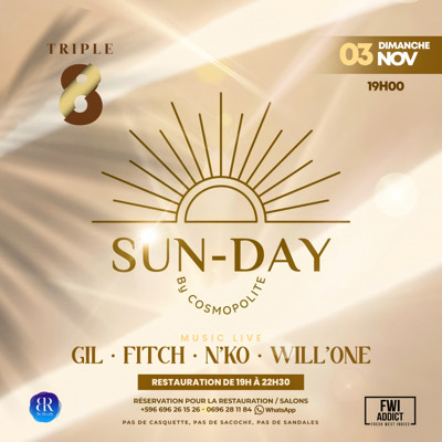 Le Cosmopolite présente la : **SUN-DAY ** Un dimanche Fin de semaine après la plage ou une journée de détente entre amis ou famille nous vous invitons , ce *Dimanche 3 novembre* au Triple 8 dès 17h à terminer la semaine en totale détente. ;) Il y aura pour tous les goûts : Electro , Salsa, Rap Zouk, Soca, Kompa, Trapp ou Shatta … bref il en aura pour tous les styles . Pas de manières sur la piste on se lache ! D’ailleurs la mise en scène est orchestrée par : *Dj GIL - Dj ...