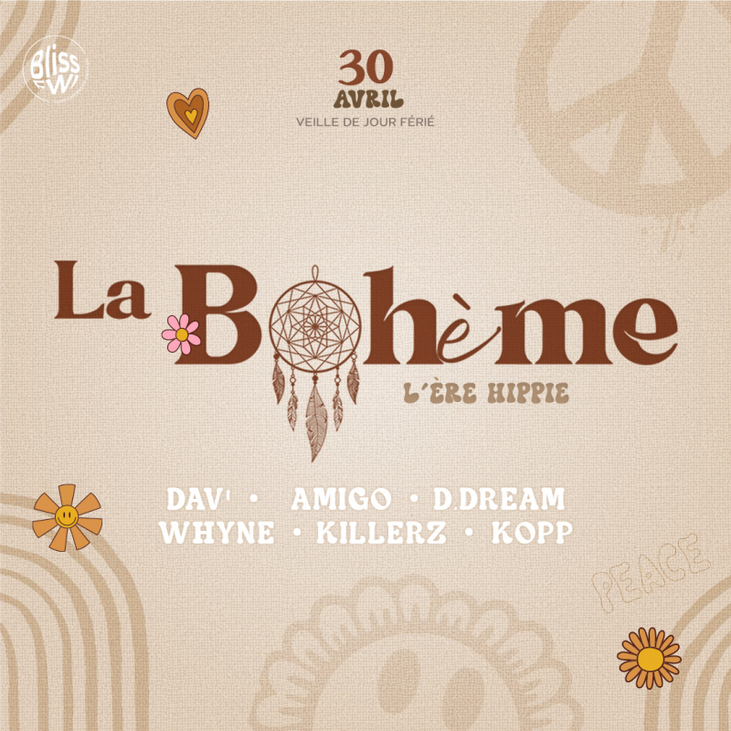 Bienvenue dans l’ère hippie prônant l’amour, la paix, et la basse. Pour éveiller vos sens DAV’ x AMIGO x D.DREAMWHYNE x KILLERZ x KOPPDress code : Un mélange subtil du style bohème chic avec l’énergie peace & love du mouvement hippie.Promis tu vas ressentir les vibrations de l’univers.