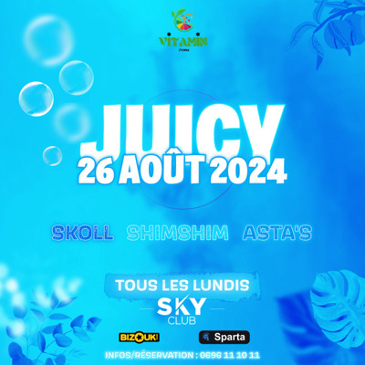 JUICY by VITAMIN ÉVENTS Prépare-toi pour une soirée mémorable tous les lundis au SKY CLUB ! Ce lundi 26 Août , viens vibrer au rythme de DJ SKOLL, DJ SHIMSHIM ET DJ ASTA’S qui feront monter l'ambiance au Sky. Lieu : SKYCLUB MARTINIQUE Réservation Salons et informations au : 0696.11.10.11 **Billets disponibles sur BIZOUK & SPARTA:** DRESS CODE : TENUE CORRECTE OBLIGATOIRE !