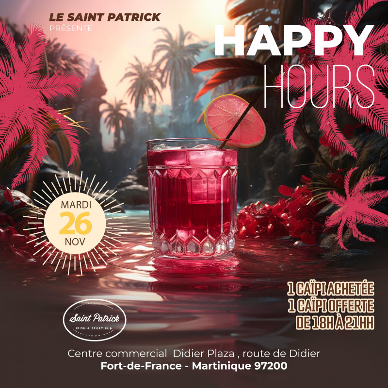 HAPPY HOUR ALERT Viens profiter de notre Happy Hour. 1 caïpi achetée = 1 caïpi offerte de 18h à 21h Viens avec tes amis pour décompresser et partager un bon moment autour d’une caïpi !