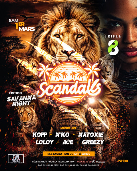 🔥 SCANDALS - SAVANNA NIGHT 🔥 🌿 Les Nuits Africaines by FWI Addict 🌿 🌙 Samedi 1er Mars 📍 Triple 8 🕖 19h - 2h 🍽️ Restauration dès 19h 🔥 Une nuit sauvage, sensuelle et envoûtante t’attend… 🔥 Prépare-toi à plonger dans une ambiance torride, entre rythmes afrobeats, caribéens et électrisants. Les corps vibrent, les regards s’enflamment, et la nuit promet d’être inoubliable… 💃🏾 DJs aux platines, prêts à te faire bouger jusqu’au bout de la nuit : 🎧 Kopp | N’Ko | Natoxie | Loloy | Ace ...