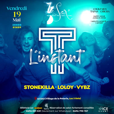 VEND 19 MAI, *🎉 L'instant T...* *🌸 STONEKILLA - VYBZ - LOLOY 🌸* 🌟 Clientèle multigénérationelle 🌟 🎁 Happy Hour jusqu'à 21h30 *🧉 1 MOJITO ACHETÉ = 1 OFFERT* 📲 0696 051 531 - 0696 790 787 (Seulement sur WhatsApp)