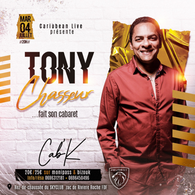 MARDI 04 JUILLET - 20 h Tony CHASSEUR a choisi la 1ère soirée CARIBBEAN LIVE pour sa première prestation des vacances. Venez gouter à l’exception, dans un nouveau lieu pensé pour vous. Le CAB K au Rez de Chaussée du SKYCLUB à la Fac de Rivière Roche Réservez vos places sur : Infolive : 0696 31 21 81 // 45 04 96 www.caribbealive.fr