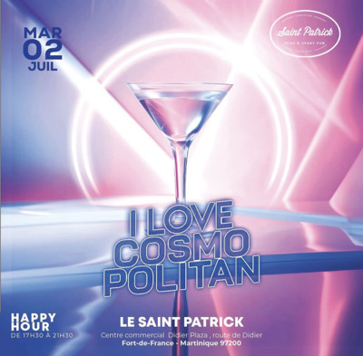 | Love Cosmopolitan Venez avec vos amis et passez une soirée mémorable autour du cosmopolitan happy Hour jusqu'à 21h30 Ouvert dès 17h30. Cc Didier Plaza ; Route De Didier . FdF +596696863950 L'abus d'alcool est dangereux pour la santé à consommer avec modération.