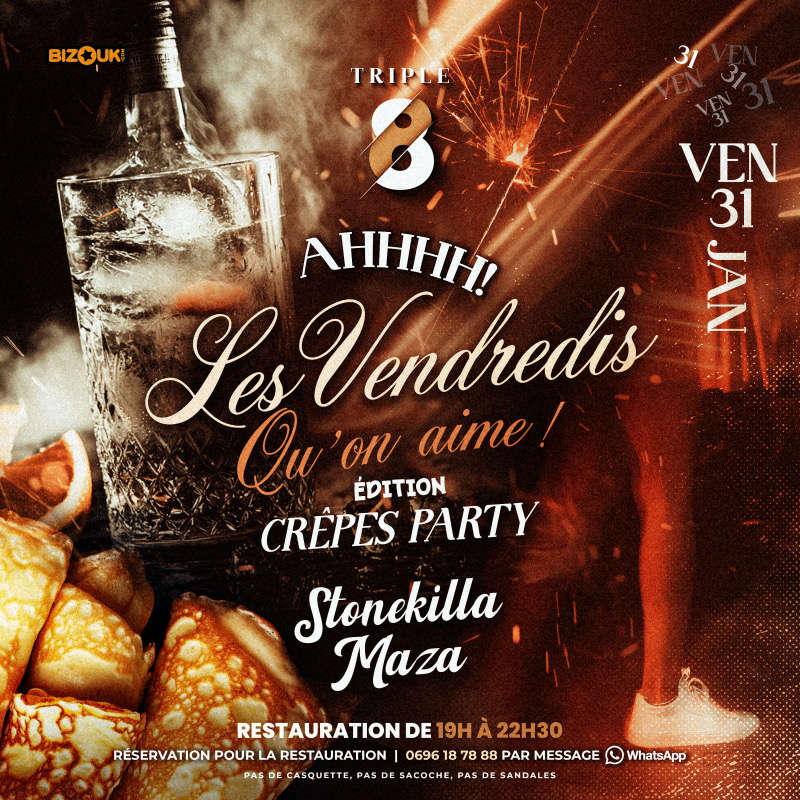 Ahhh les vendredis qu’on aime, une soirée vraiment wouaaaaaaw On adore Ce vendredi 31 janvier au Triple 8, tu connais déjà le délire… Ton meilleur mood, ton meilleur outfit et on kiffe ensemble Tes Djs préférés Ton spot préféré Tes sons préférés Une nouvelle saison qui démarre en beauté... Ce sera tout simplement HOT & GOURMAND Un duo de choc de fou with Stonekilla, Maza - que demander de plus ? Soyez beaux, soyez frais, soyez on fleek GRATUIT SUR INVITATION Biz...