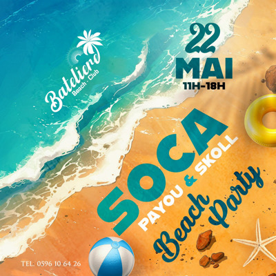 Soca Beach Party | Tout’ moun an dlo Le BBC te donne rendez-vous pour son édition " SOCA BEACH PARTY " le mercredi 22 mai PAYOU X SKOLL pour vous ambiancer de 11h à 18h ! Offre : 1 Bouteille de vin rosé Jolie fille achetée > Une part d’accras offerte 2 Buckets de despé achetés > Une part de tapas offerte