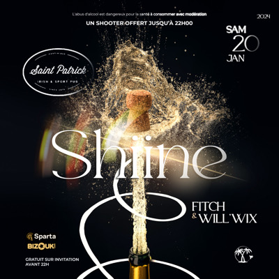 𝓢𝓱𝓲𝓲𝓷𝓮✨🍾 Nous nous donnons rendez-vous pour la première soirée de l’année 2024 le : 🗓️ 𝗦𝗔𝗠𝗘𝗗𝗜 𝟮𝟬 𝗝𝗔𝗡𝗩𝗜𝗘𝗥 **Au Saint-Patrick**📍 Débute l’année en beauté aux côtés de : 🎧 𝘿𝙅 𝙁𝙄𝙏𝘾𝙃 & 𝘿𝙅 𝙒𝙄𝙇𝙇’ 𝙒𝙄𝙓 🥃 Récupère ton SHOOTER offert avant 22h00 à l’entrée !** Récupère ton invitation gratuite et viens briller comme il se doit 💫 ☎️ : Infos & réservations de salon au : 0696 77 96 18 (WhatsApp) 𝗢𝘂𝘃𝗲𝗿𝘁 𝗱è𝘀 𝟮𝟬𝙝 𝗖𝗰 𝗗𝗶𝗱𝗶𝗲𝗿 𝗣𝗹𝗮𝘇𝗮 ; 𝗥𝗼...