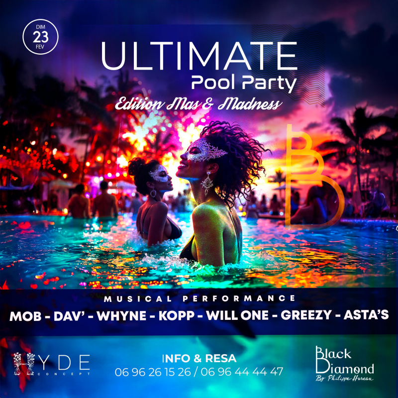 On ne te l’a présenté plus ULTIMATE Hyde Pool Party au Black Diamond édition « MASS & MADNESS »Ce Dimanche 23 Février pour bien démarrer le Carnaval 2025Des Djs de Folie pour t’ambiancer toute la journée.Horaires: 14h-22h