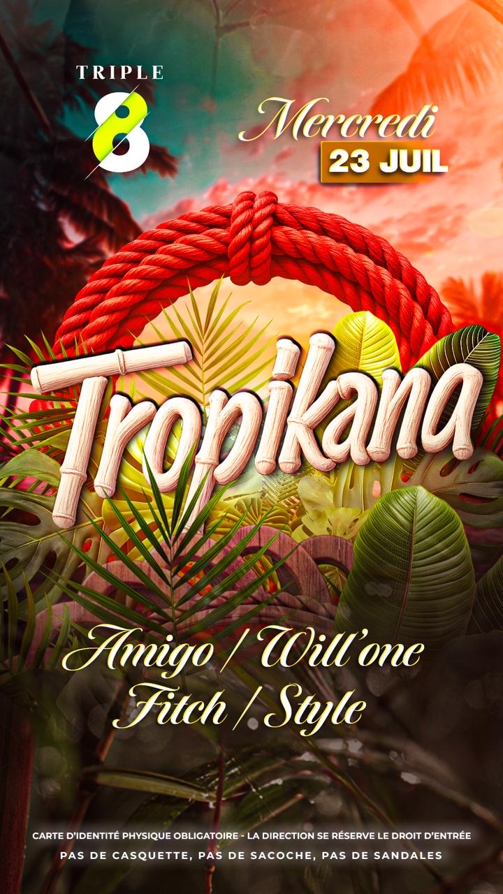 💐🥥*TROPIKANA* 💐🥥 L'évasion commence ce *MERCREDI 23 JUILLET* 📍*TRIPLE 8 DÉS 19H*🍉🌺 Prêts à plonger dans la fête ?🎊💃🏽🕺🏽 🌬️Imaginez l'air chaud caressant votre peau, des palmiers 🌴dansant au rythme des brises, dans chaque coin du Triple 8, une atmosphère festive vous attend avec des cocktails exotiques 🍹cela nous rappelle juste que l'été approche à grands pas.🌝👙 Mets ta tenue d'été.👕👚 Orchestrée par un casting de djs 🎧 prêts à vous faire passer un moment mémorable. *AMIG...