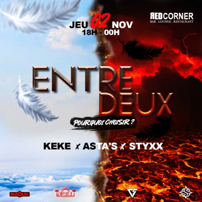 REJOINS-NOUS DANS L'ENTRE-DEUX ! La DRILL EVENT et la CBS t'invitent à faire un choix crucial : seras-tu un Ange angélique ou un Démon diabolique ? Date : Jeudi 2 novembre Heure : De 18h à minuit Lieu : REDCORNER Trois juges : DJ KEKE, DJ ASTA'S et DJ STYXX, s'occuperont de ton destin ! Prépare-toi à plonger dans l'obscurité ou à briller dans la lumière, car ton destin sera scellé dans une ambiance incroyable. Le bien ? Le mal ?