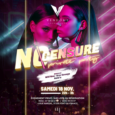 🔞NO CENSURE🔞 Rejoignez-nous ce Samedi 11 novembre pour la XIeme éditions de la NO CENSURE 🎶L’événement sera animé par trois DJ de la Martinique, Dj WILL’ONE, SCAR SAVAGE & Dj ASTA’S 📀 🥂Viens nous retrouver au Vendôme de 22h jusqu’au bout de la nuit… pour une ambiance encore plus sensuelle et explosive. Événement sur liste !!! ❌ Pas sur liste = Pas d’entrée ❌ 📲 Réserves ton salon VIP au : +33 7 88 04 27 01 / +596 696 44 44 47 Liste valable jusqu’à 1h30 après plus d’entrée !!! C...