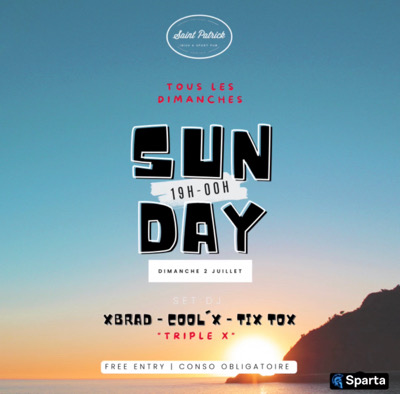 ```SUN DAY``` Les dimanches du Saint-Pat ! *DIMANCHE 02 JUILLET* Direction le SAINT-PATRICK, à partir de 19h ! ```On boit un verre, on prend du bon son, le reste viendra tout seul, simplement.``` Entrée libre, consommation obligatoire. L’équipe de la Triple X sortie de France pour vous servir ! "DJ X-BRAD - COOL’X - TIX TOX" ARRIVEZ TÔT