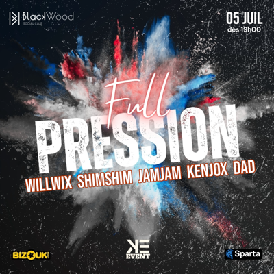 Hello la Team Pression « La Full Pression » au BLACKWOOD Vendredi 05 Juillet c’est le bordel organisé façon K’RIBBEAN EVENT Tu connais déjà le concept alors emmène ta team et viens te défouler en compagnie des maîtres de la pression: WILLWIX JAMJAM KENJOX SHIMSHIM et en Guest : DAD