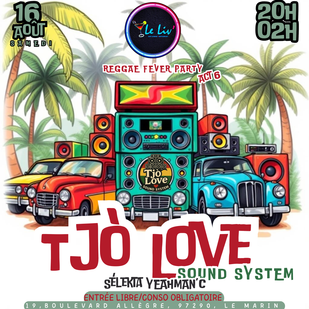 ❤️💛💚ATTENTION ⚠️ WARNING 🔥 *LE LIV’BAR ET TJÒ LOVE sounds système* présente ❤️💛💚 TJÒ LOVE SOUND SYSTEME ❤️💛💚 REGGAE FEVER ACT 6 📆 SAMEDI 16 AOÛT 2025 📍LE LIV’ BAR ⏰20H-02H 🎧 Sélekta MAN’C & Dj Blast 🥗🍤FOOD & DRINK’S🍻🍹 on remets le reggae à l’honneur... EN TJÒ LOVE ❤️ EN TJÒ SON 💛 EN TJÒ RESPÉ 💚 entrée gratuite consommation OBLIGATOIRE... REGGAE VYBS ONLY🇧🇴🇧🇴