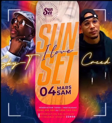 I LOVE SUNSET🌅 DJ SKY-T et DJ CREED RÉSERVATION TAPAS / RESTAURANT 0696 294 984 oU 0696 540 530 TRESERVATION OBLIGATOIRE ET VALABLE JUSQU'À 22H00