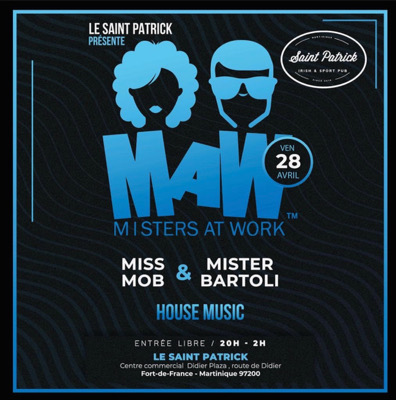 Ven 28Avril au Saint Patrick - Misters at Work - une fête sans complexe avec Miss Mob et Mister Bartoli au Saint Patrick pour le meilleur de la House & Electro. 20h-2H. Réservation : 0696194006 Saint Patrick : Centre commercial Didier plaza . FDF.