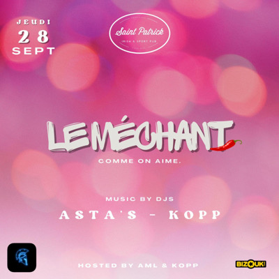 CE JEUDI 28 SEPT RENDEZ-VOUS AU SAINT-PATRICK À PARTIR DE 19H pour le Méchant Duo Vient prendre la Vibes et un MAXIMUM de pression avant d’attaquer le week end ! ASTA’S & KOPP pour vous servir UNE OFFRE GIRLY : Vient avec tes copines Une bouteille de vin offerte aux groupes de 4 femmes ou plus avant 21 h 30 . Arrive tôt c’est on finit à minuit . RÉSERVATION DE SALONS : (Whatsapp only) 0696.06.00.26
