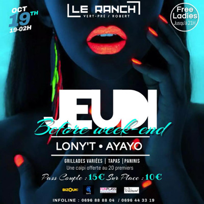 *C’EST AU RANCH* TOUS 𝐿𝐸𝑆 𝐽𝐸𝑈𝐷𝐼𝑆’ *BEFORE WEEK-END‼️* **DE 19H À 2H ** 🟥_* ON S’AMUSE AUSSI AVANT LE WEEK-END 🤪🥳*_ **🎯ℂ𝔼 𝕁𝔼𝕌𝔻𝕀 19 octobre 𝕝e BEFORE WEEK-END au RANCH votre lieu incontournable ** 💽 Dj LONY’T et Dj AYAYO 💿 *Prévente : PASS COUPLE 15€* Lien : Bizouk - Funpass - Sparta. *Sur place 10€* *RESTAURATION SUR PLACE* 💢POULETS GRILLÉS 💢LAMBIS GRILLÉS 💢POISSONS FRITS 💢CÔTES DE PORC GRILLÉES 💢BROCHETTES DE ROGNON 💢TAPAS 💢PANINIS (th...