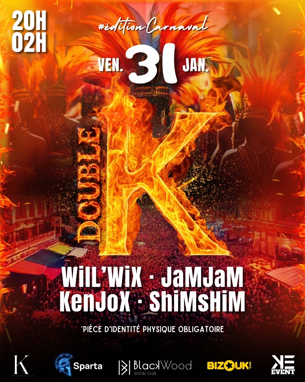 Vendredi 31 janvier, prépare-toi pour une soirée légendaire ! La Double K – Édition Carnival, c’est l’occasion de vibrer au rythme des meilleurs sons avec : Will’Wix, JaMJaM, KenJoX et ShiMsHiM aux platines pour te faire bouger non-stop. Costumes, couleurs et énergie : l’ambiance du carnaval t’attend pour une explosion de good vibes ! Pièce d’identité obligatoire. Invitation valable jusqu’à 22h Ne manque pas ce rendez-vous unique pour célébrer comme jamais !