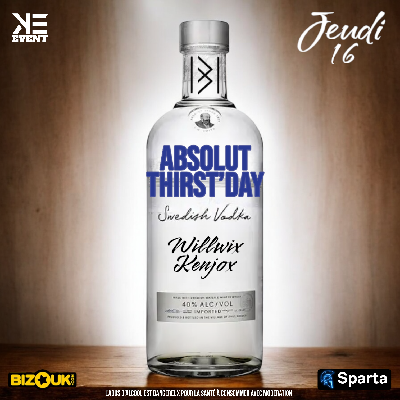 Jeudi 09 Janvier ABSOLUT THIRST’DAY RENDEZ-VOUS AU BLACKWOOD POUR UN AFTERWORK EN MODE VOLKA AU PLATINE: WILLWIX KENJOX ET POUR L’OCCASION ON VOUS METS BIEN JUSQU’A 23H c’est HAPPY HOUR DEUX BOUTEILLES DE VODKA POUR 160€