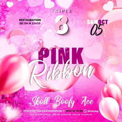 PINK RIBBON* TRIPLE 8 Octobre est enfin là... Le Rose, le Ruban , tout plein de symboles qui nous rappellent que parfois, la vie, c'est aussi, de la solidarité, de l'entraide et de la sensibilisation... Samedi 05 octobre 19h/02h Ton ticket (entrée ou restauration) contribuera à une bonne action.. On en dit pas plus pour le moment... *Djs Boofy, Ace, Skoll* ATTENTION *PAS DE CASQUETTE* *PAS DE SANDALES* *PAS DE SACOCHE*