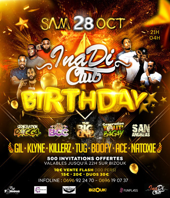 *INADICLUB BIRTHDAY* Hellooooo... My ssss.... On vous dévoile progressivement le Line Up de la 2eme édition de l' INADICLUB BIRTHDAY BLICAAAA..... *Blicassty* nous réserve un show Monumental 🎊🎉 Ps : Petite Pensée au *Ti Bli de feu* 🔥 🗓️ Samedi 28 Octobre Direction le *BAMBOU RIVER * 20h - 03h https://my.bizouk.com/inadiclub-birthday https://fpl.tw/D858D1FC1