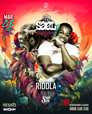 Ton rendez-vous du mardi soir de ces vacances 2023, c'est au Sunset Dans le cadre des Mardis Saëllite au Sunset, Saël reçoit Riddla pour le 5ième épisode. Ambianceur confirmé, Riddla promet de mettre le feu au Sunset. Concert live ! Soyez prêts ! Réservation de salon : 0696 540 530 Possibilité d'avoir un pass pour toutes les dates : 0696 829 309