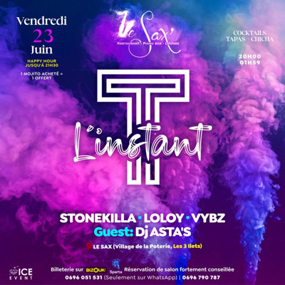 Rejoins le cercle de L'instant T... Une explosion de couleur musicale avec STONEKILLA - VYBZ - LOLOY Clientèle multigénérationelle Happy Hour jusqu'à 21h30