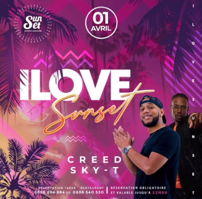 ILOVE Sunset 🍾❤️🔥 DJ CREED - DJ SKY.T RÉSERVATION TAPAS RESTAURANT | RESERVATION OBLIGATOIRE 0696 294 984 ou 0696 540 530 ET VALABLE JUSQU'A 22H00