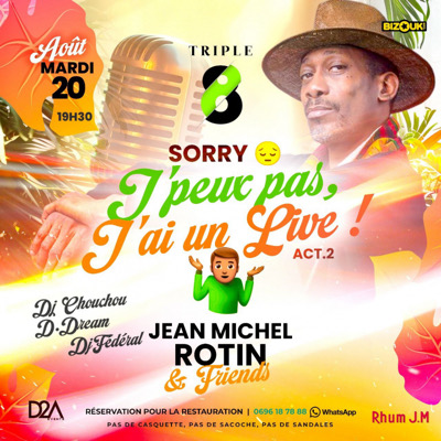 Sorry , J’peux pas, J’ai un Live ! Rendez vous ce Mardi 9 Juillet 2024 au Triple 8 Aux platines Dj Chouchou Dj Fédéral & D.Dream Mais surtout pour les amoureux de Live ! JEAN MICHEL ROTIN & Friends ! Music Live - Tapas - Ambiance ? À bientôt au Triple 8 INFOLINE & RÉSERVATIONS : 0696 65 57 27