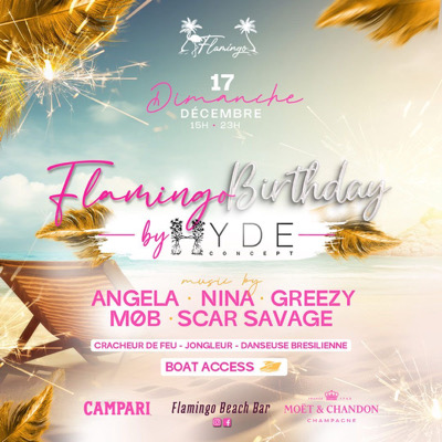 🌈_*FLAMINGO BIRTHDAY*_ _Beach Party_ ⛱️ 🏝️ *By Hyde concept*🏖️ 🗿Ce _Dimanche 17 Décembre_ de 15h à 23h 📍Flamingo Beach Bar au Carbet. ⛱Oui, oui vient fêter avec nous les 4 ans du Flamingo, on t’a préparé pleins de surprises, n’oublie pas ton maillot c’est une beach party 🎶 🎧Avec nos Famous Deejays *MOB* *NINA MONA* *ANGELA* *SCAR SAVAGE* *GREEZY* Tenue: maillot de bain, short de bain, chemise à fleurs, beach outfit, rayban, Gucci, Cazal… bref tu l’auras compris, ambiance Beach Chic⛱️...