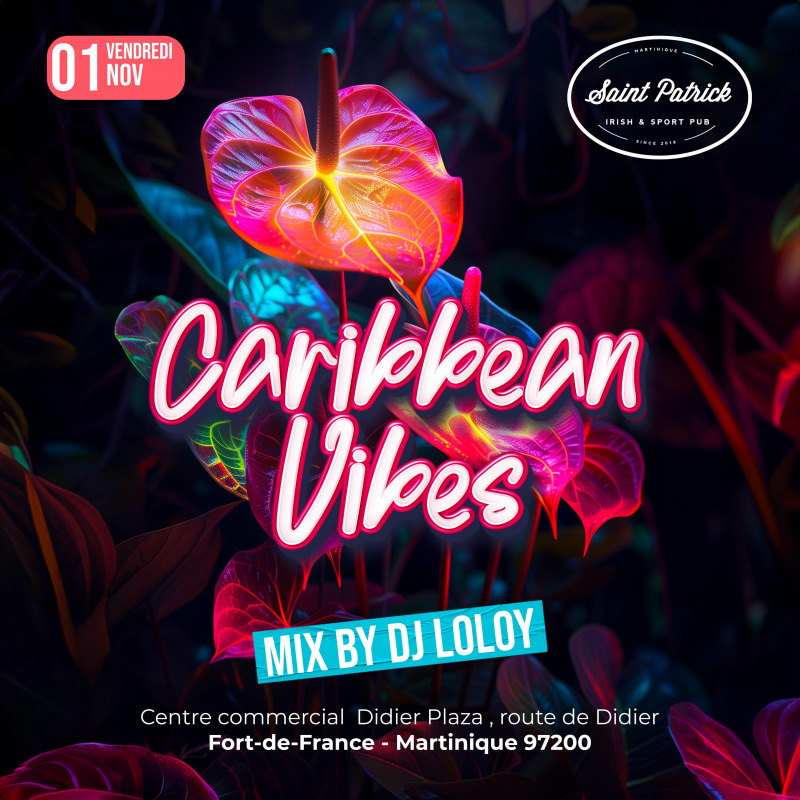 Caribbean Vibes Ce vendredi 1 er novembre à partir de 20h, les meilleurs sons caribéens mixés par Dj Loloy Dans une ambiance unique: -Cocktails rafraîchissants - Convivialité garantie Réservation de salon au 0696 86 39 50