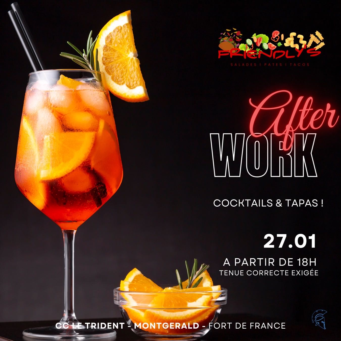 FRIENDLY’S AFTERWORK Entre ami(e)s, collègues ou en famille ! Viens, viens passer un bon moment ce vendredi 27 janvier à FRIENDLY’S. un nouveau restaurant, ton nouveau rendez-vous Chill Dj’s, tapas originaux, cocktails & Chicha seront au rendez-vous pour te faire découvrir FRIENDLYS