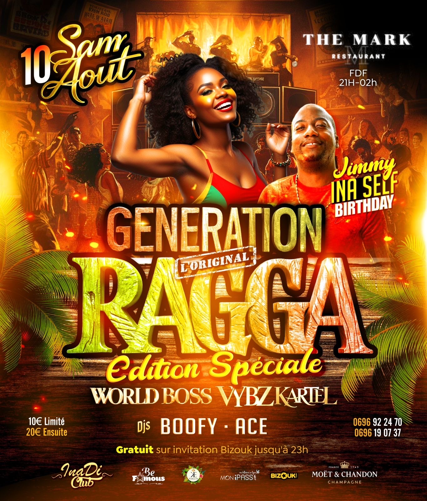 🌟*GENERATION RAGGA L'ORIGINAL*🌟 🔥 *IL PARAIT QUE 2 MONTAGNES NE SE RENCONTRENT JAMAIS* 🔥 🎉2 Évènements exceptionnels à célébrer: 🎂L'anniversaire du Boss *JIMMY COTON* PÉLAGIE alias *Ina Self* 🎊Free World Da Boss *VYBZ KARTEL* 🕺🏽💃🏽Nous serons En Mode *COMME À L'ÉPOQUE* Des Sound Systèm🕺🏽💃🏽 📆 *CE SAMEDI 10 AOÛT* 📍 *THE MARK à FDF* ⏰ *21H - 02H* Pour Mettre Le Feu 🔥 🎶 🎧 *BOOFY • ACE* 🎧 🎫 *GRATUIT SUR INVITATIONS JUSQU'À 23H* *Bizouk :* https://my.bizouk.com/générati...