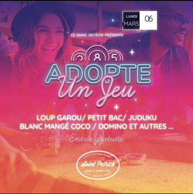 saintpatrick_pub « Adopte un Jeu » !! Ta nouvelle soirée jeux pour bien commencer la semaine! Ce Lundi 6 Mars on te donne rendez vous au Saint Patrick Bar, autour d'un bon cocktail pour une soirée de partage, de rencontre et de bonne humeur ! @* Révèle ton côté stratège au loup Garou, défi tes amis aux fléchettes ou au domino, partage un moment entre amis ou fait de nouvelles rencontres autour d'un blanc mangé coco ou un petit bac' revisité. @ On t'attend de 20h à minuit au Saint Patrick à Didie...